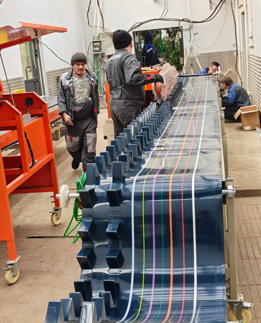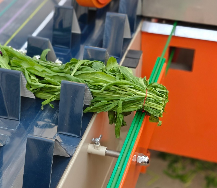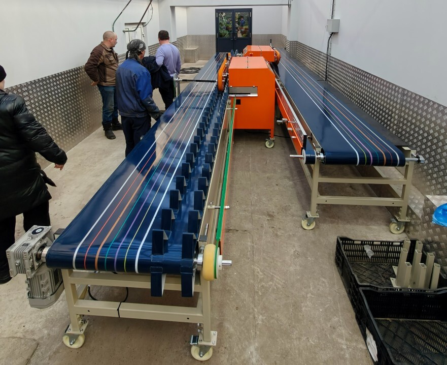 - Зона сортировки. Ручная сортировки на 2-3 ростовки. Каждый оператор берет свой размер и формирует банч. На ленте есть полосы разных цветов для удобства отбора по длине. Также в этой зоне производится автоматический подсчет количества обрезанных стеблей.