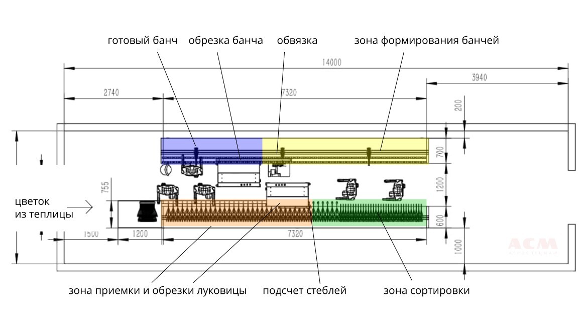 Ниже чертеж линии, размещенной в помещении, с указанием зон и рабочих узлов.