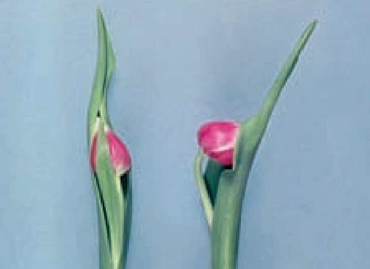 Стадии прерывания образования почек внутри луковицы тюльпана после воздействия этилена: 1. Кончики одной из тычинок становятся менее жесткими; 2. Все тычинки дряблые; 3. Все тычинки, нити и листочки околоцветника сморщиваются; 4. Пестик засыхает, и все цветочные органы желтеют; 5. Все цветочные органы поникают и становятся желтовато-коричневыми; 6. Внутренний лист бутона увядает; 7. Все листья увядают, становятся похожими на бумагу и обесцвечиваются (De Munk, 1973).